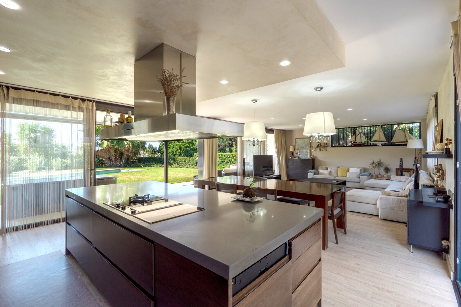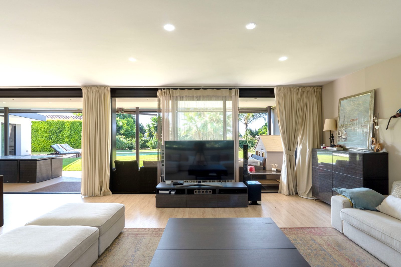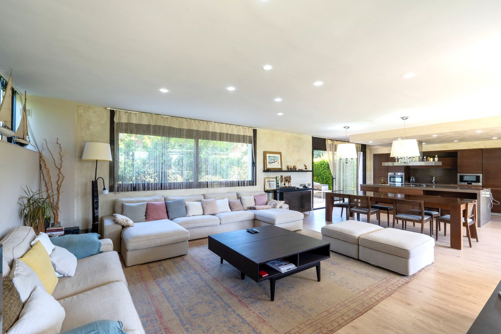 Amplio salón con ventanales y salida al jardín